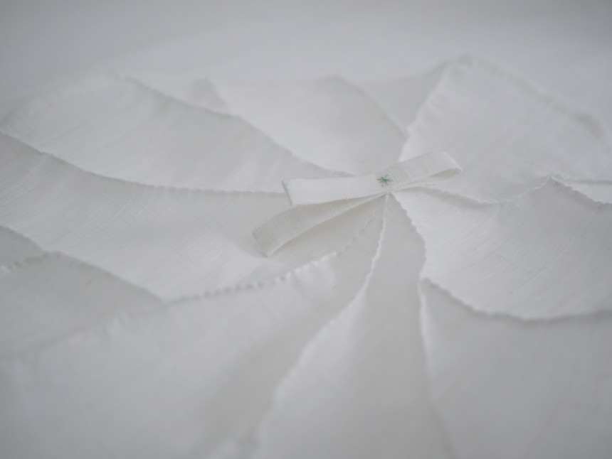 - This handcrafted piece showcases delicate pin-tucking stitches, carefully hand-sewn to depict each vein of the lotus leaf one by one. Rather than using a fixed pattern, every piece features unique leaf veins and shapes, making each item truly one of a kind.