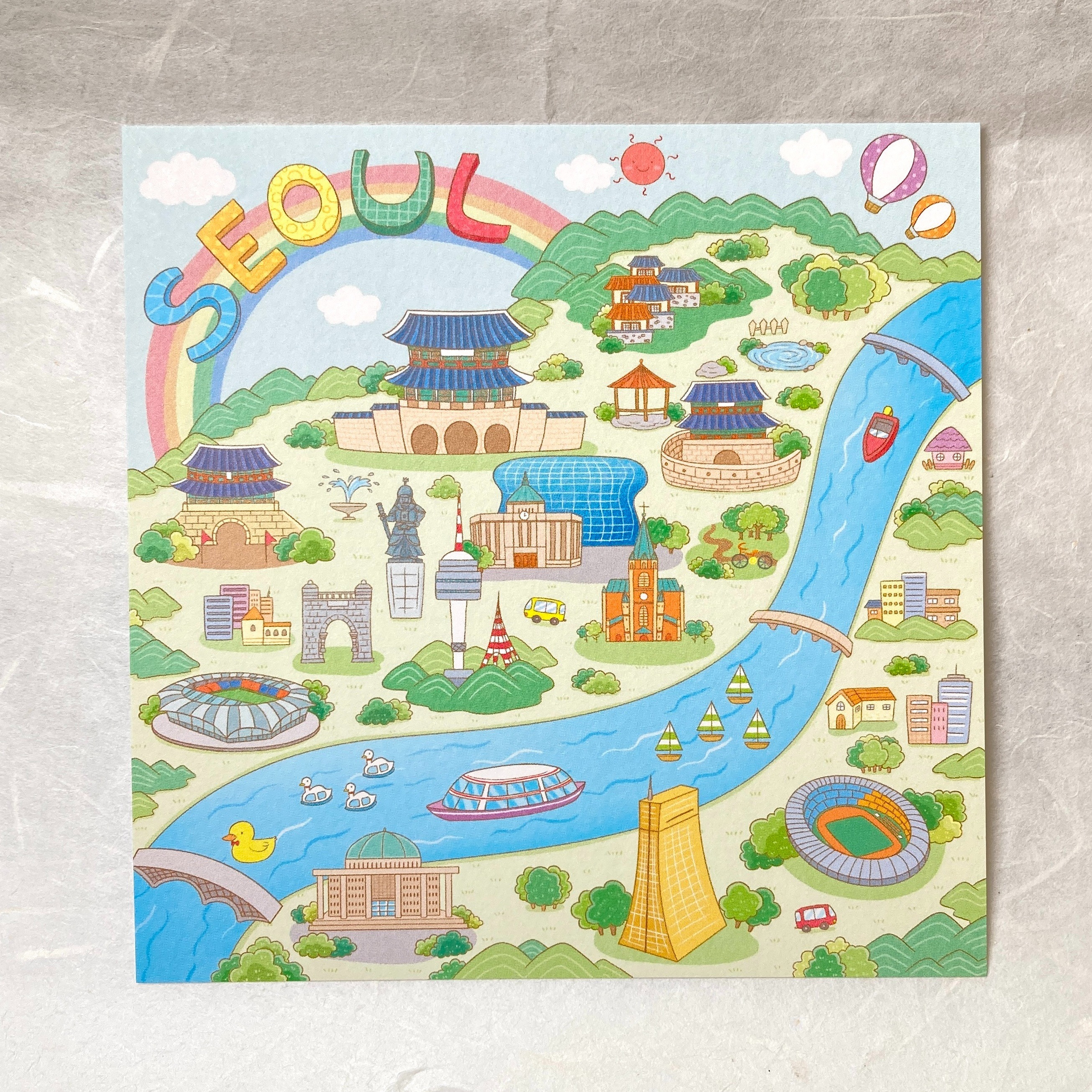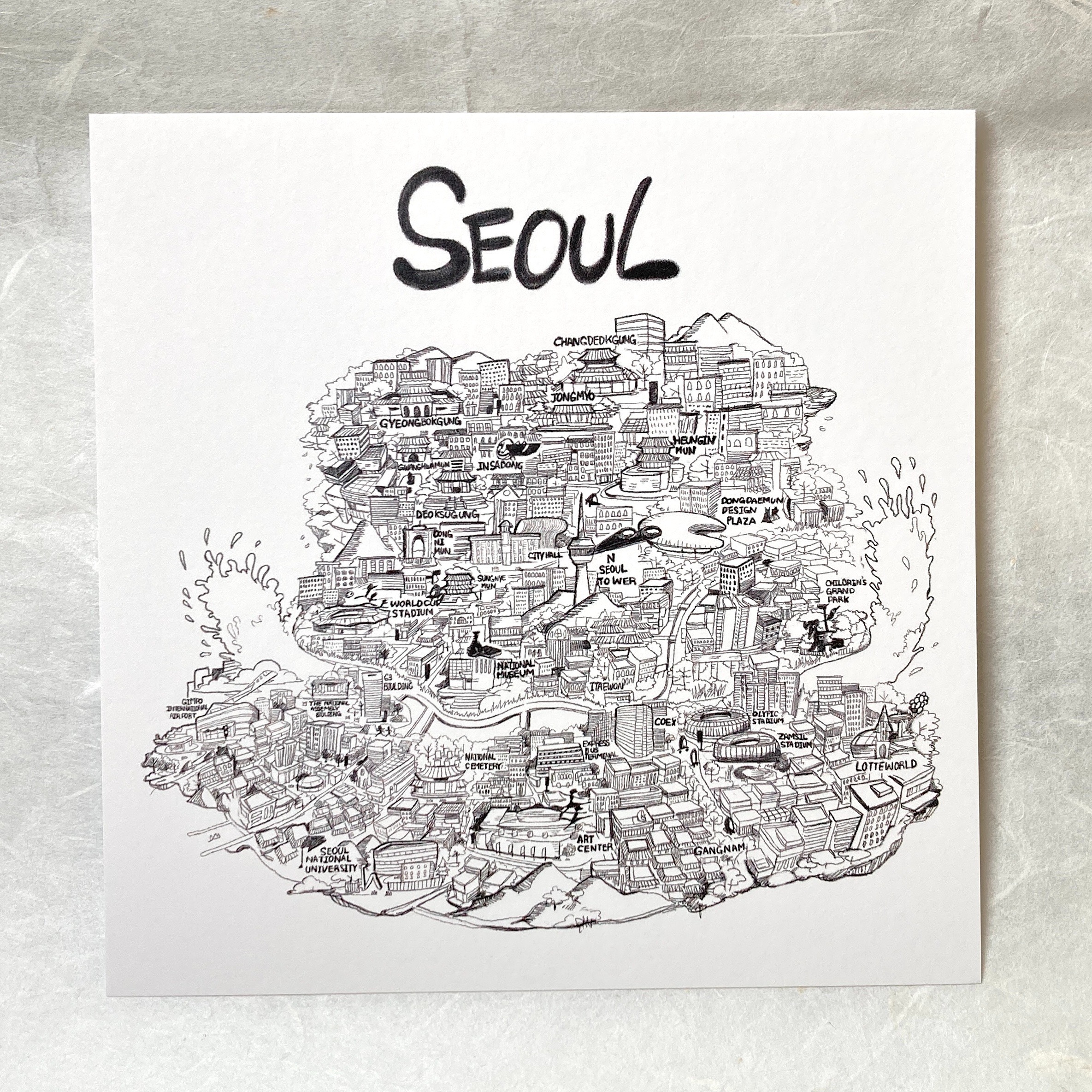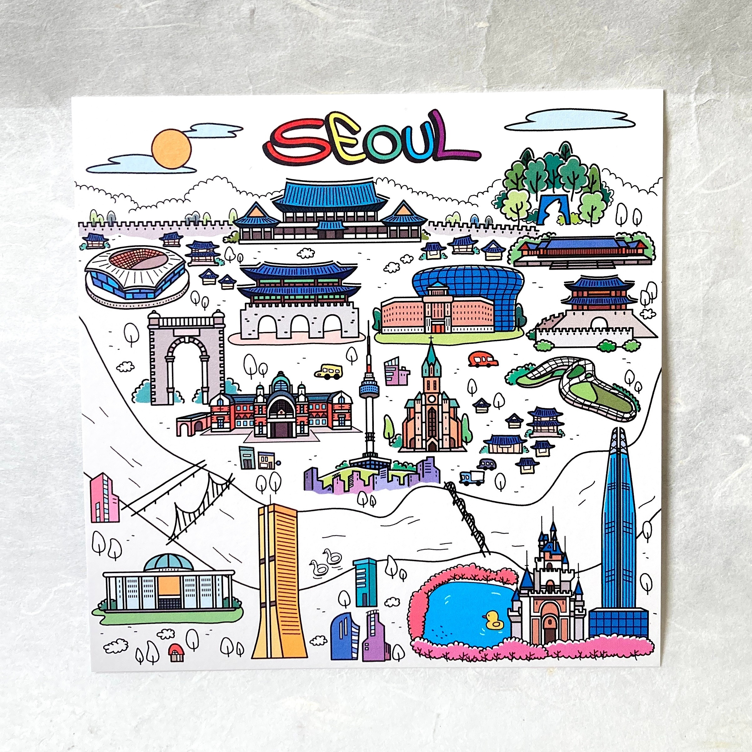 - Rather than focusing on a single landmark, this postcard captures a wide range of places and objects in Seoul—inviting you to discover a scene that may spark a personal memory.